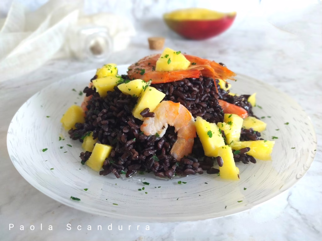 First course: Venus Rice with Prawns, Mango and Lime A summery and exotic dish: brown venus rice with sautéed prawns, mango cubes and a touch of lime and mint. 18.06.2025