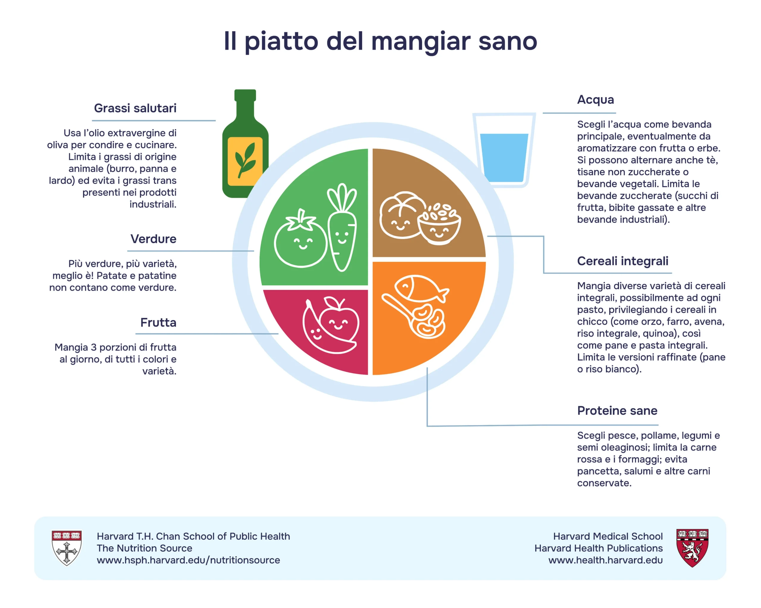 Il “Piatto del Mangiar Sano”, ideato dagli esperti di nutrizione dell’Università di Harvard, rappresenta in modo visivo la composizione ideale di ogni pasto della giornata, dalla colazione alla cena.